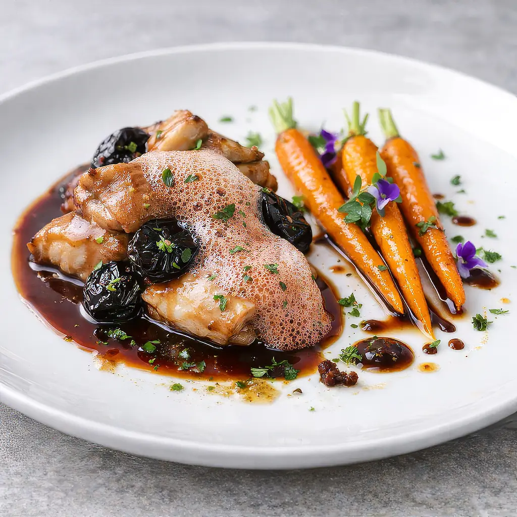 Râble de lapin aux pruneaux revisité, carottes fanes