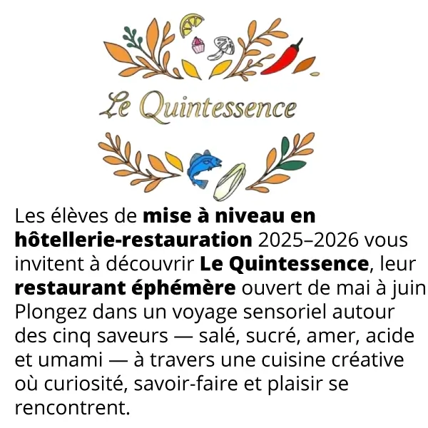 Cette année le thème choisi est « Les 5 saveurs » . Le nom du restaurant éphémère sera donc : « Le Quintessence » .