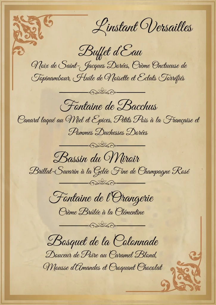 Un menu cinq services dont les intitulés autant que les plats ont ravi les plus fins gourmets, ainsi « Buffet d’eau », « Fontaine de Bacchus », « Bassin du Miroir », « Fontaine de l’Orangerie » et « Bosquet de la colonnade ».
