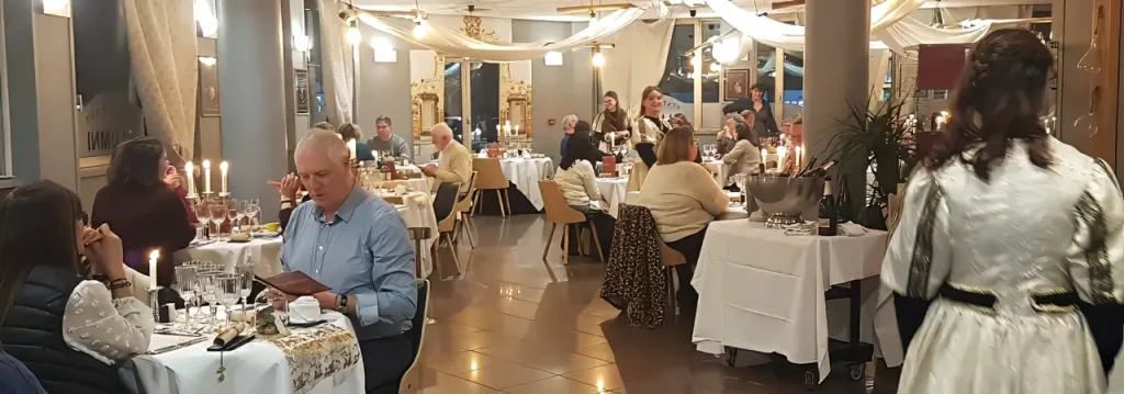 Dès leur arrivée, les 60 convives qui s’étaient inscrits en un week-end, sitôt l’événement annoncé et programmé, ont été séduits par la magie du décor mis en place. Accès du restaurant transfiguré et reproduisant le portail du château de Versailles… vue panoramique sur les somptueux jardins imaginés par Le Nôtre agrémentant tout un mur de la salle… et un aréopage de sept serviteurs zélés magnifiquement costumés.